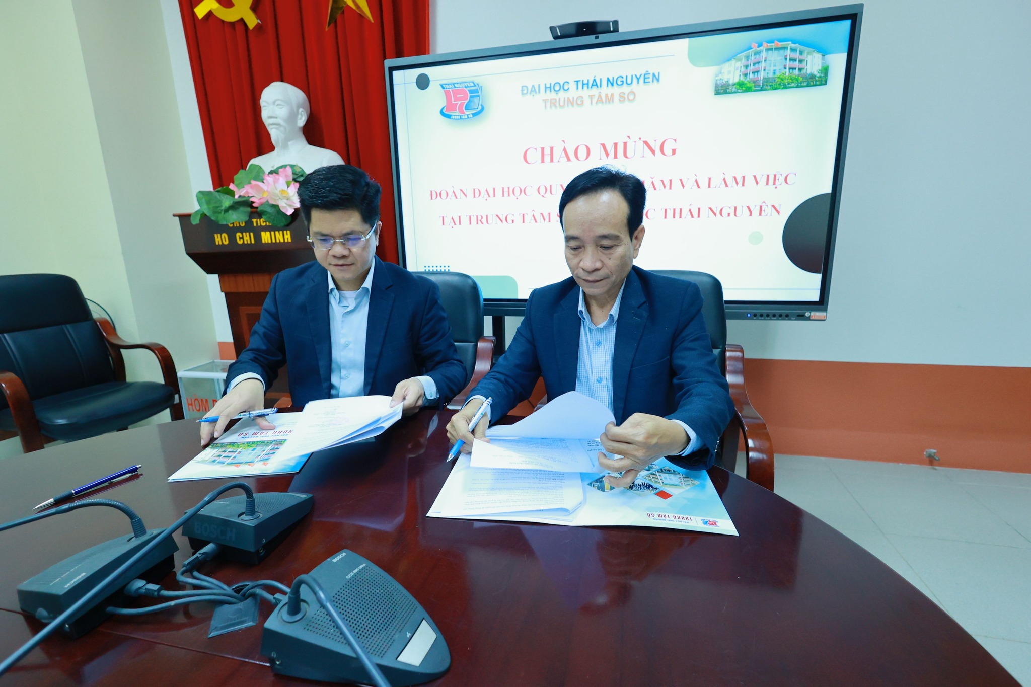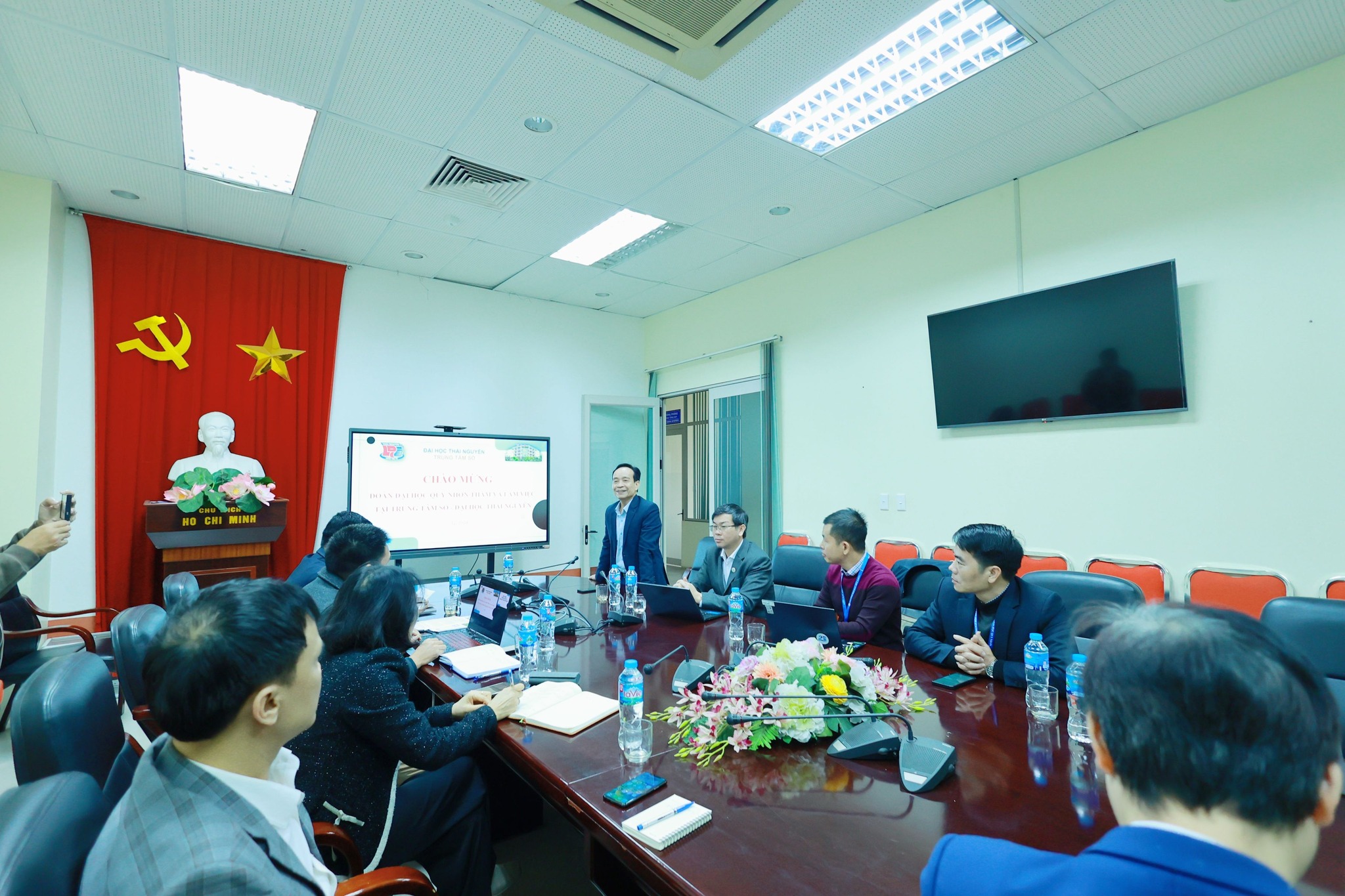Tiếp đón và làm việc với đoàn công tác QNU, về phía Trung tâm Số - Đại học Thái Nguyên có PGS.TS Trần Nhuận Kiên - Giám đốc Trung tâm, cùng các cán bộ chủ chốt của Trung tâm. Về phía Đại học Quy Nhơn, có TS. Đinh Anh Tuấn - Phó Hiệu trưởng QNU, TS. Nguyễn Thanh Bình - Chủ nhiệm dự án 6 IUC-QNU, TS. Lê Thanh Hải - GĐ. Thư viện, PGS.TS. Nguyễn Tiến Trung - Trưởng phòng P.KHCN&HTQT, TS. Nguyễn Thành Đạt - Giám đốc TTCNTT&TT, ThS. Đào Phương Hoa - Phó Trưởng phòng P.CTCT-SV.